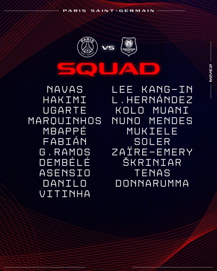 4月3日訊 北京時(shí)間明天凌晨,巴黎將在法國杯半決賽中對(duì)陣?yán)锥?。巴黎宣布了這場比賽的球員名單,由姆巴佩和登貝萊領(lǐng)銜,馬爾基尼奧斯回歸。