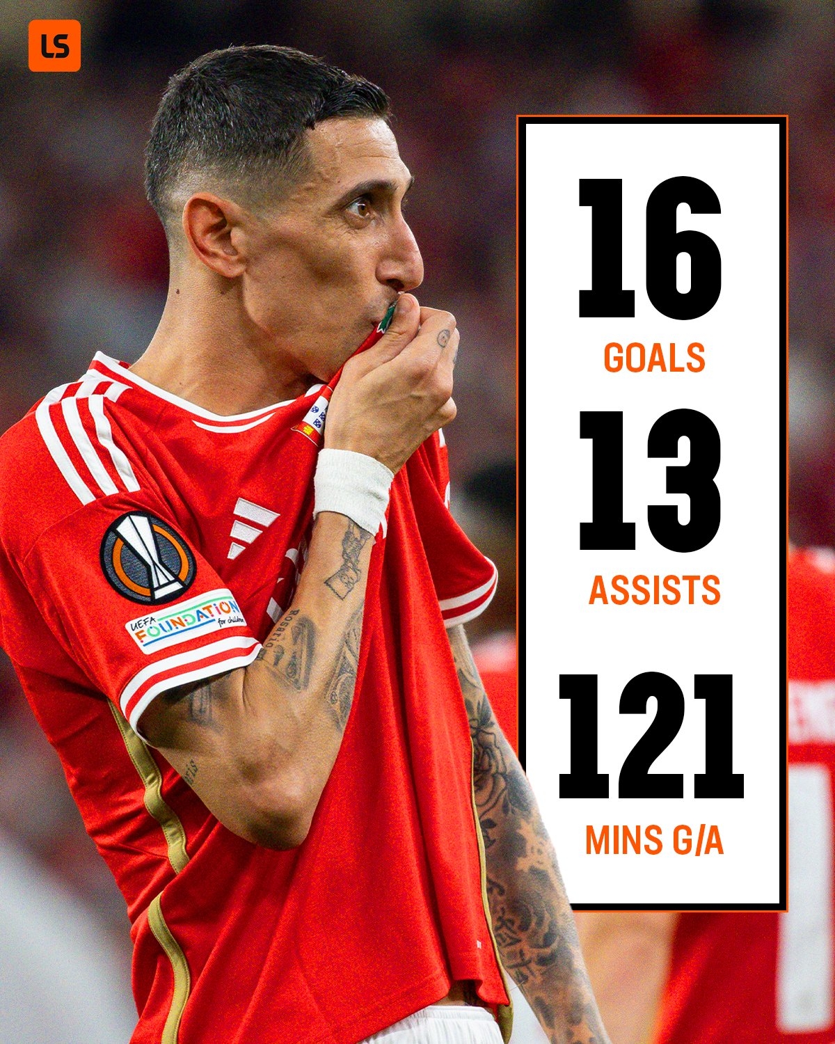 36歲的迪馬利亞本賽季為本菲卡打了43場(chǎng)比賽,攻入16球,助攻13次,幫助本菲卡進(jìn)入歐羅巴聯(lián)賽8強(qiáng),葡萄牙超級(jí)聯(lián)賽排名第二,落后葡萄牙體育4分。